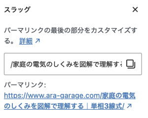 スラッグの命名ルールは英数字とハイフンのみ・スペースなし・短めが基本です。たとえば「家庭の電気のしくみ」であれば katei-denki-shikumi のように設定します。記事数がまだ少ない今のうちに習慣化しておくと、あとで困らなくて済みます。